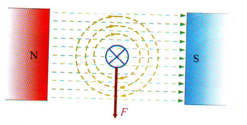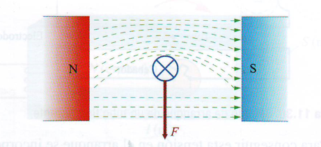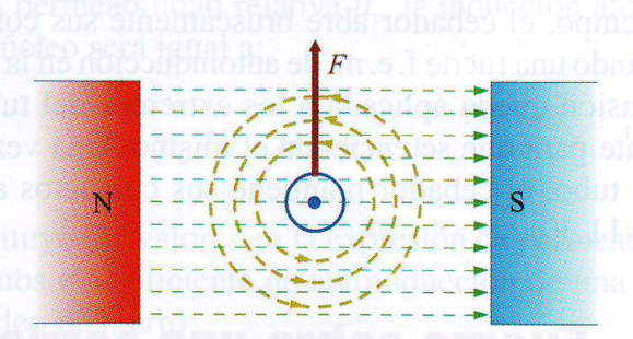 En la siguiente figura se puede ver un conductor eléctrico atravesado por una corriente entrante y sometido a la acción del campo magnético de un imán.
