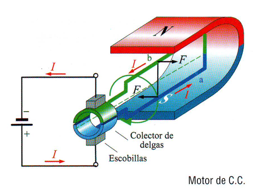 En un motor de C.C. se consigue que cada unos de los conductores opuestos de la bobina desarrolle un par de fuerzas que hace girar el motor (ver figura).