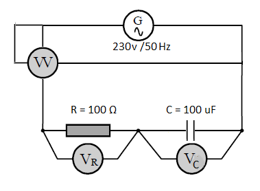 En el circuito de la figura se muestra un circuito R-C. Averigua la lectura de los aparatos de medid, así como la intensidad de la corriente, potencia reactiva, potencia aparente y el f.d.p. Dibuja el diagrama vectorial.