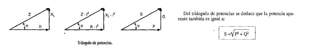 Triángulo de potencias: Al igual que hacíamos con las tensiones e impedancias, también se puede construir un triángulo que relacione las tres potencias que se dan en un circuito de C.A. Si partirnos, por ejemplo, del triángulo de impedancias y multiplicarnos a los vectores del mismo por I2 obtendremos el triángulo de potencias de la figura