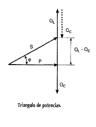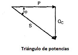 En cuanto a las potencias que se dan en el circuito, indicar que en la resistencia se produce potencia activa que se transforma en calor. Por otro lado, en el condensador aparece una potencia reactiva provocada por las constantes cargas y descargas del mismo. Al dibujar el triángulo de potencias (ver figura) observamos que la potencia reactiva Qc queda invertida, lo que nos indica que ésta posee un valor negativo respecto a la potencia reactiva que producen la bobinas.