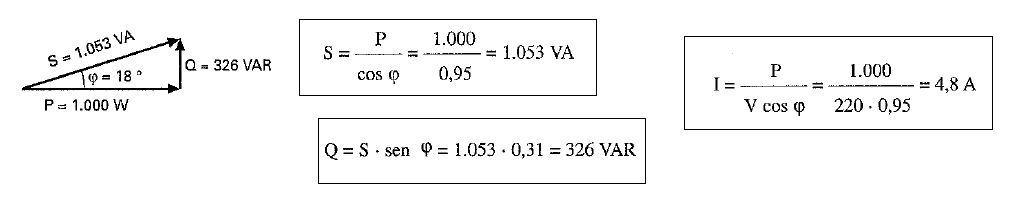 De los datos obtenidos se deduce que el motor produce un consumo de 1.000 W, pero necesita de un suministro de 1.667 VA por la línea para funcionar. Si por algún método consiguiésemos mejorar el factor de potencia hasta, por ejemplo, 0,95 obtendríamos los siguientes valores: