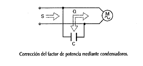 Los condensadores compensan parte de la potencia reactiva de las bobinas. Hay que pensar que en el instante en que las bobinas descargan su energía reactiva, los condensadores se cargan con la misma. En el siguiente cuarto de ciclo, los condensadores devuelven esta energía acumulada a las bobinas para que puedan desarrollar los campos electromagnéticos. De esta forma se evita que parte de la energía reactiva de las bobinas tenga que fluir constantemente por los conductores de la línea, desde el generador hasta las mismas y viceversa. Las compañías eléctricas no facturan la energía reactiva, pero exige que los consumidores trabajen con un factor de potencia cercano a la unidad (en torno a cos φ = 0,9). Para ello disponen de equipos de medida para determinar el f.d.p. medio utilizado durante el período de facturación. Dado que la energía reactiva no se cobra, lo que se hace es aplicar un recargo en el precio de KWh consumido a los clientes que trabajen con un f.d.p. por debajo del recomendado.
