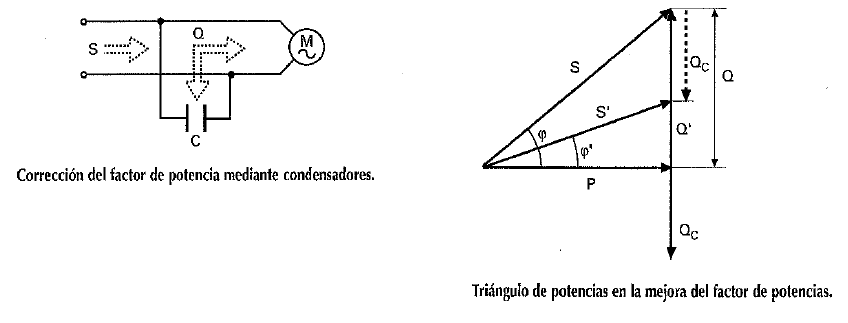 De lo que se deduce que al acercar el factor de potencia a la unidad obtenemos una reducción de corriente considerable, así como de la potencia aparente y reactiva. Para contrarrestar el consumo excesivo de potencia reactiva de carácter inductivo y así reducir también la potencia aparente y la corriente por la línea se instalan condensadores conectados en paralelo con los receptores, tal como se muestra en la siguiente figura.