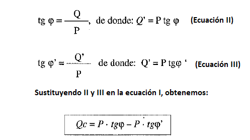 Calcularemos ahora la potencia reactiva que es necesario que tenga la batería de condensadores para corregir el f.d.p. de nuestro ejemplo: