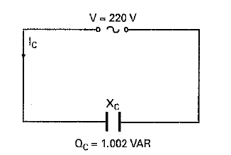 Para determinar la capacidad del condensador y la corriente eléctrica que lo alimenta, tenemos en cuenta que el condensador está acoplado directamente a la red a una tensión de 220 v y con una potencia reactiva de 1.002 VAR, tal como se muestra en la figura. En este caso se cumple que la potencia reactiva del condensador es igual a: