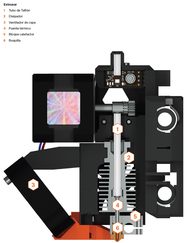 El extrusor, o cabezal de impresión, está diseñado para depositar las capas impresas extruyendo plástico fundido. Primero, el filamento entra en el extrusor a través de un tubo de Teflón. En ese momento, el filamento es un cilindro de plástico sólido y está a temperatura ambiente. Atraviesa un disipador, que es una pieza diseñada para evacuar el calor procedente del puente térmico y minimizar el espacio entre el filamento sólido y fundido. El disipador normalmente tiene un ventilador montado en un lado para incrementar su capacidad de enfriamiento. El puente térmico es básicamente un tubo con rosca exterior, que es más estrecho en un extremo para minimizar el diámetro lo más posible, de modo que menos calor pueda subir hacia la zona en la que el filamento debe permanecer aún sólido.