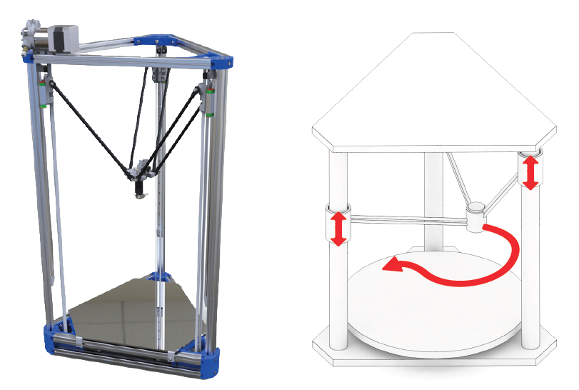 Son impresoras en las que el movimiento del extrusor se realiza controlado por tres brazos móviles que se unen en el extrusor. Dos de sus principales ventajas son la velocidad de impresión y poder imprimir grandes volúmenes. Sin embargo, la impresora requiere un montaje y calibración extremadamente precisos. La geometría de la impresora requiere cálculos complejos para el movimiento de los motores de cada uno de los brazos.
