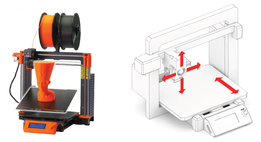 Se denominan así por el sistema de coordenadas XYZ. El movimiento del extrusor se realiza en dos ejes (X y Z) mientras que la base de mueve a lo largo del eje Y. También significa que la base de impresión es cuadrada o rectangular. La impresora 3D Original Prusa i3 MK3S es una impresora cartesiana.