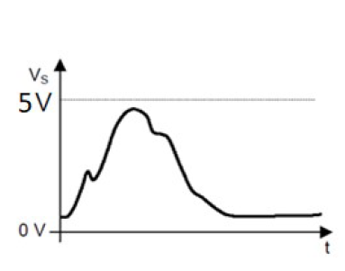 a) Colocamos la LDR al aire libre, expuesta a luz natural. Esta luz irá variando a lo largo del día, y tendrá variaciones debidas, por ejemplo, a la ocultación temporal del sol por el paso de alguna nube. Si representamos en un gráfico la variación de la tensión en el punto S (con respecto a masa) a lo largo del tiempo, obtendremos una curva similar a la de la figura:
