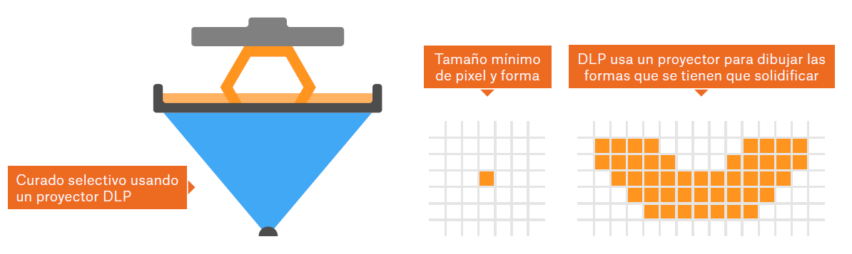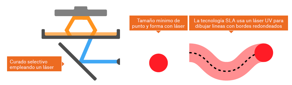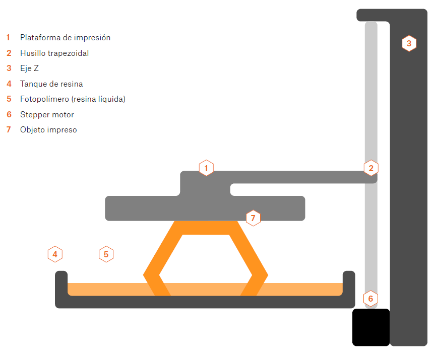 La tecnología SLA está basada en torno a resinas fotosensibles líquidas que pueden curarse (solidificarse) mediante luz ultravioleta (UV). Las impresoras 3D SLA tienen una plataforma que se mueve una vez que una capa se ha solidificado para crear espacio para la nueva capa que se adherirá a la anterior. Comparada con las impresoras FFF, las piezas tiene mucho más detalle, sin embargo, la impresión tarda normalmente más tiempo y el volumen de impresión es menor. Estas impresoras son especialmente adecuadas para industrias como la joyería o la medicina. Las piezas impresas tienen superficies suaves, mucho detalle y las capas son prácticamente invisibles a simple vista – especialmente comparado con impresoras FFF. El principal inconveniente de esta tecnología puede ser la menor superficie de impresión y la toxicidad de las resinas líquidas. Deberías evitar que estas resinas toquen tu piel y evita respirar sus vapores.