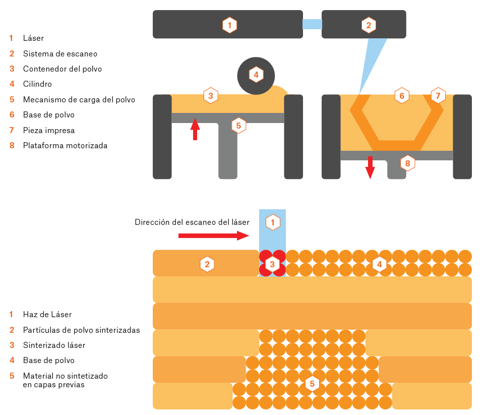 Otros tipos de tecnologías de impresión 3D son SLS y DMLS, que usan un proceso denominado sinterizado. En esencia, cada vez que se imprime una capa, un cilindro esparce una fina capa de un polvo fino sobre la plataforma, que es a continuación sintetizado por la acción de un láser para que tome la forma deseada. Cuando la impresión finaliza, la pieza entera está cubierta de polvo. Debido a cómo funciona este método, las piezas deben de tener agujeros por los cuales pueda salir el polvo sobrante. El polvo no sinterizado se puede reciclar para nuevas impresiones, lo que significa que poco material se desperdicia. Otra ventaja es que las capa son prácticamente invisibles.