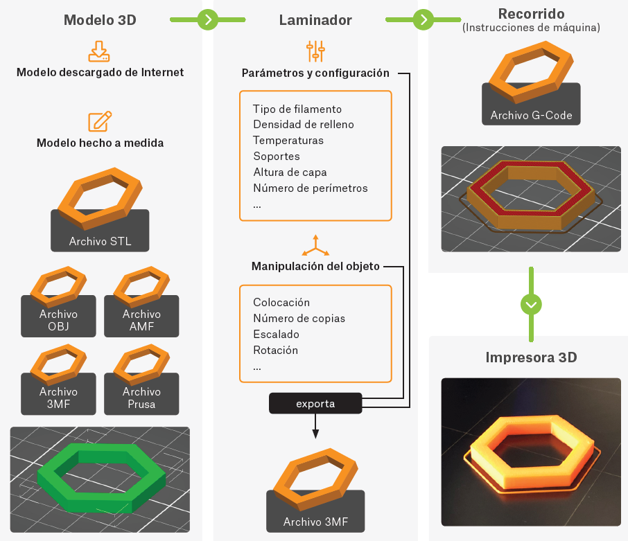 El esquema más abajo muestra los pasos individuales que conducen a una impresión 3D exitosa.