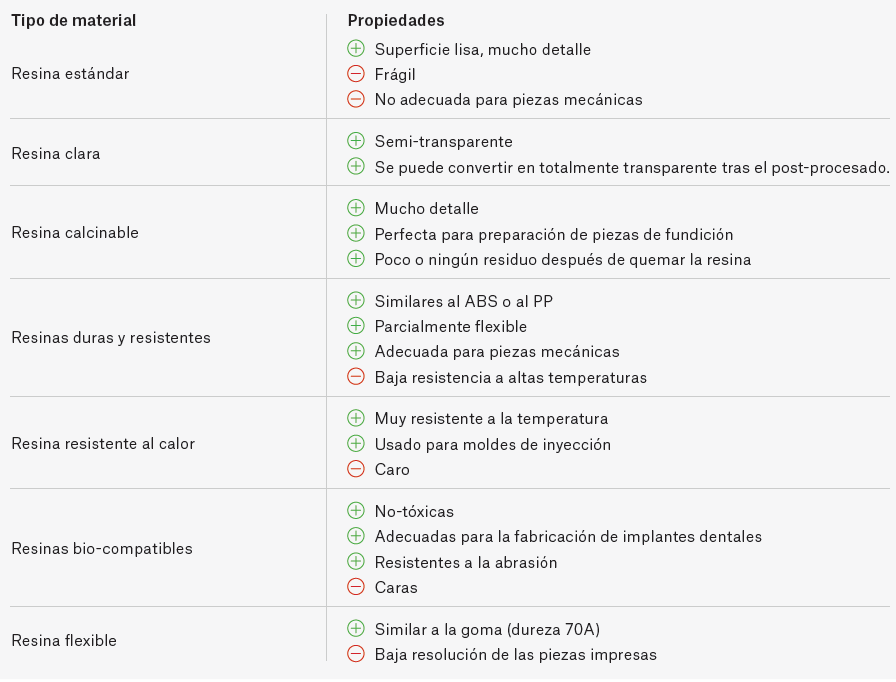Las resinas (también llamadas Foto-polímeros o resinas sensibles al UV) son materiales para las impresoras 3D SLA. Las resinas son líquidos, que se curan (solidifican) mediante la exposición a la luz UV. Las resinas son bastante más caras que los filamentos, pero su precio puede variar según sus propiedades. La resina más económica puede costar unos 30 dólares el litro, pero materiales más avanzados puede costar hasta 400 dólares por litro – estas suelen ser resinas de uso dental o resinas calcinables. Generalmente, las impresoras SLA son más frágiles que las impresoras FFF. Por otra parte, las piezas impresas por SLA no se fracturan por las líneas de capa – sino que por el contrario, se agrietan como el cristal.