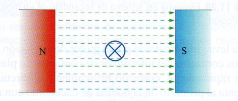 D.0.11. El conductor de la figura tiene una longitud de 0,5 metros y está inmerso en un campo magnético de 1,3 teslas de inducción. Averiguar el sentido de desplazamiento del mismo, así como la fuerza que desarrollará cuando circulen por él una intensidad entrante de 10 A.