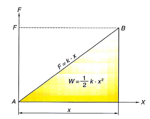 El trabajo será el área de la superficie limitada por la curva F = k·x. Como se trata de un triángulo bastará con aplicar la fórmula de resolución del área de cualquier triángulo.