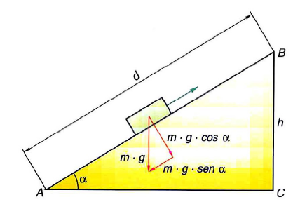 Descompongamos la fuerza de la gravedad que actúa sobre él en dos componentes que hay que vencer, una paralela y otra normal al plano. Para el cálculo del trabajo, sólo hemos de tener en cuenta la primera, pues la segunda corresponde al trabajo de fricción que supondremos despreciable.